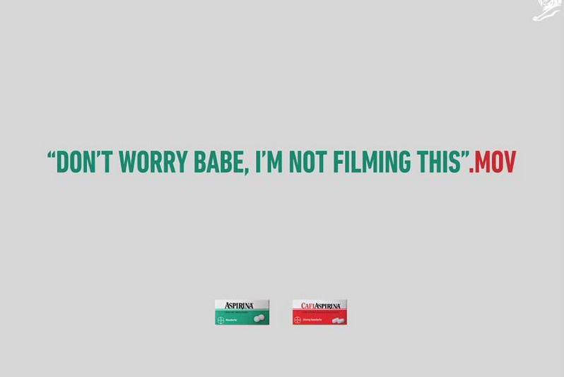 "Don’t worry babe, I’m not filming this," is the tagline for an ad created by Brazilian agency AlmapBBDO for Bayer aspirin. The type is in all caps in the middle of the bare, gray ad, otherwise only showing minuscule images of the Aspirina and CafiAspirina products. Many observers took to social media to accuse Bayer of condoning the filming of sexual activity without consent.