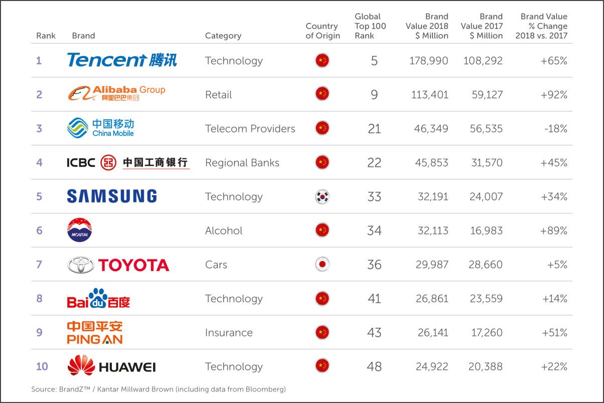 Overall, 14 Chinese brands now appear in the top 100 ranking, and the total value of China’s top 10 grew 47% year-over-year, more than double the 23% growth recorded by US brands. India and Indonesia are also showing strong regional growth, Kantar Millward Brown reported.