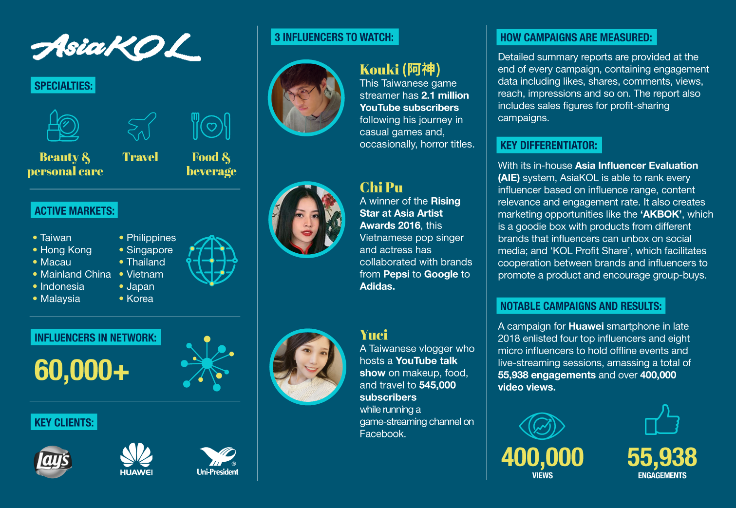 Learn about 10 other APAC influencer marketing platforms through infographics covering network size, areas of specialisation, active APAC markets, metrics, key clients and more: