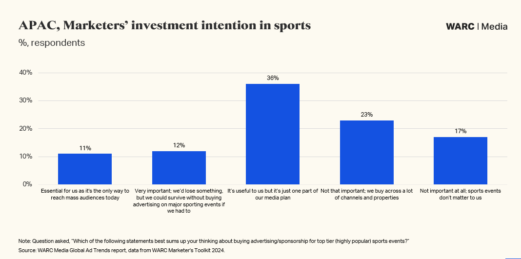 36% of APAC marketers think that although useful, buying advertising/sponsorship for top tier sports events is just one part of their media plan.