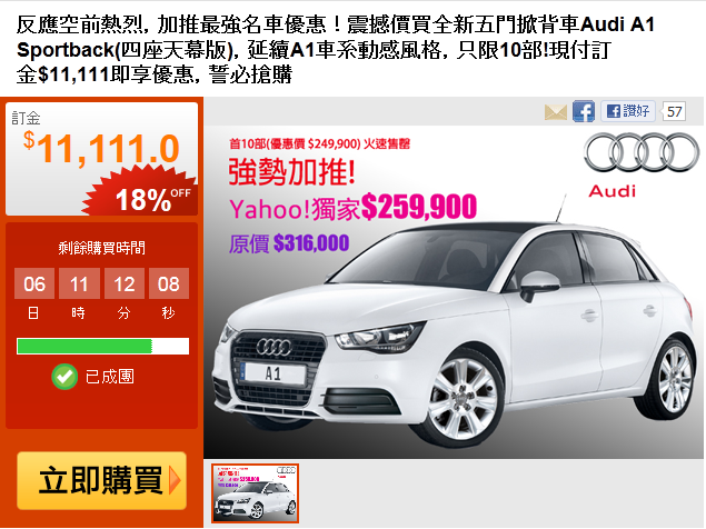 HONG KONG - Audi has offered its first group-buying deal in the city, selling its A1 Sportback at an 18 per cent discount. The most expensive product ever sold via a group-buying website also broke the mold of group-buying being seen as an aggregator of cheap treats.