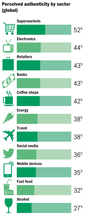 Overall, consumers view supermarkets as the most authentic sector (52 per cent of global respondents said so), while fast food and alcohol sat at the opposite end of the scale.