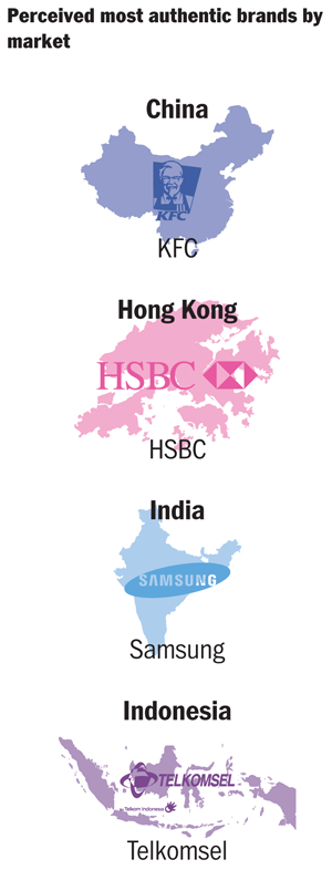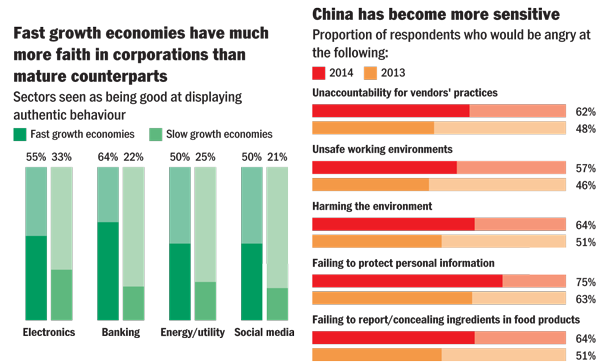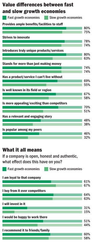 Globally, people in fast-growing economies are a lot less jaded than their counterparts in slow growth economies. For example, 64 per cent see the banking sector displaying ‘authentic’ behaviour, as opposed to 22 per cent elsewhere.