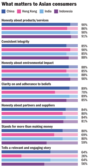 Nonetheless, consumers in the four Asian markets included in the study—which also looked at India and Indonesia—remain sceptical about big business. Just 8 per cent in Hong Kong see large corporations as honest and transparent. The figure rises somewhat in China, with Indonesians by far the most trusting.