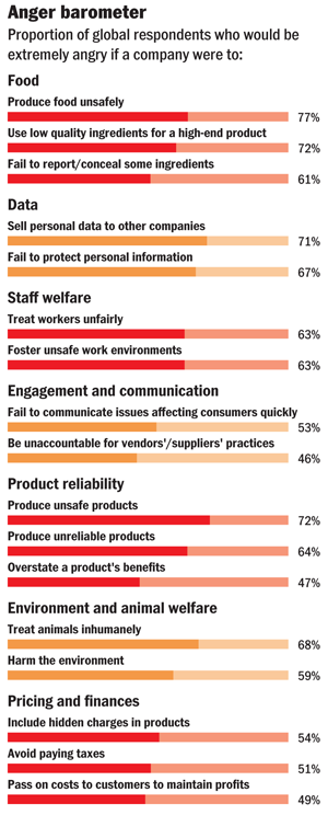 Unsafe food processes are what really make people upset: excepting Indonesia, more than three-quarters of respondents say they would become very angry if a company were found to skimp on the safety of its food products. Being open and honest clearly pays off. In fast-ßgrowth economies, more than 60 per cent of respondents say they are more loyal to a company and recommend it to others if its practices fit with their values.