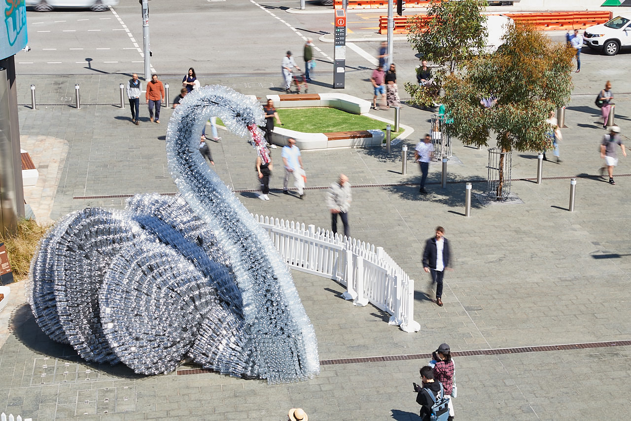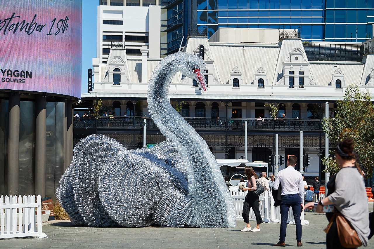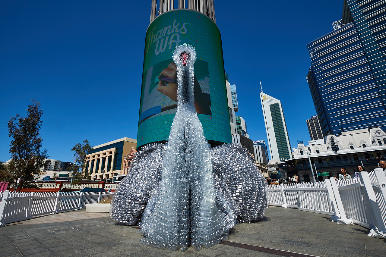 Ahead of the launch of recycling push, a massive swan created out of 10,000 plastic bottles appeared Friday in Perth. The bird, created by The Works, heralds the impending Containers for Change (CFC) program in Western Australia, which will charge a 10-cent deposit on each bottle sold and then give consumers that money back when they put used bottles into the recycling stream.
