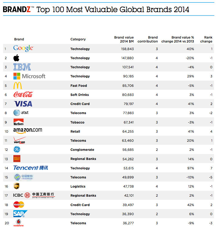 Overall, technology brands performed strongly. Although these companies represent less than a fifth of the top 100, they make up nearly a third of the total value. Service-based brands such as Tencent, Facebook and Baidu are thriving while product-based companies like Samsung, HP and Sony are struggling in relative terms.