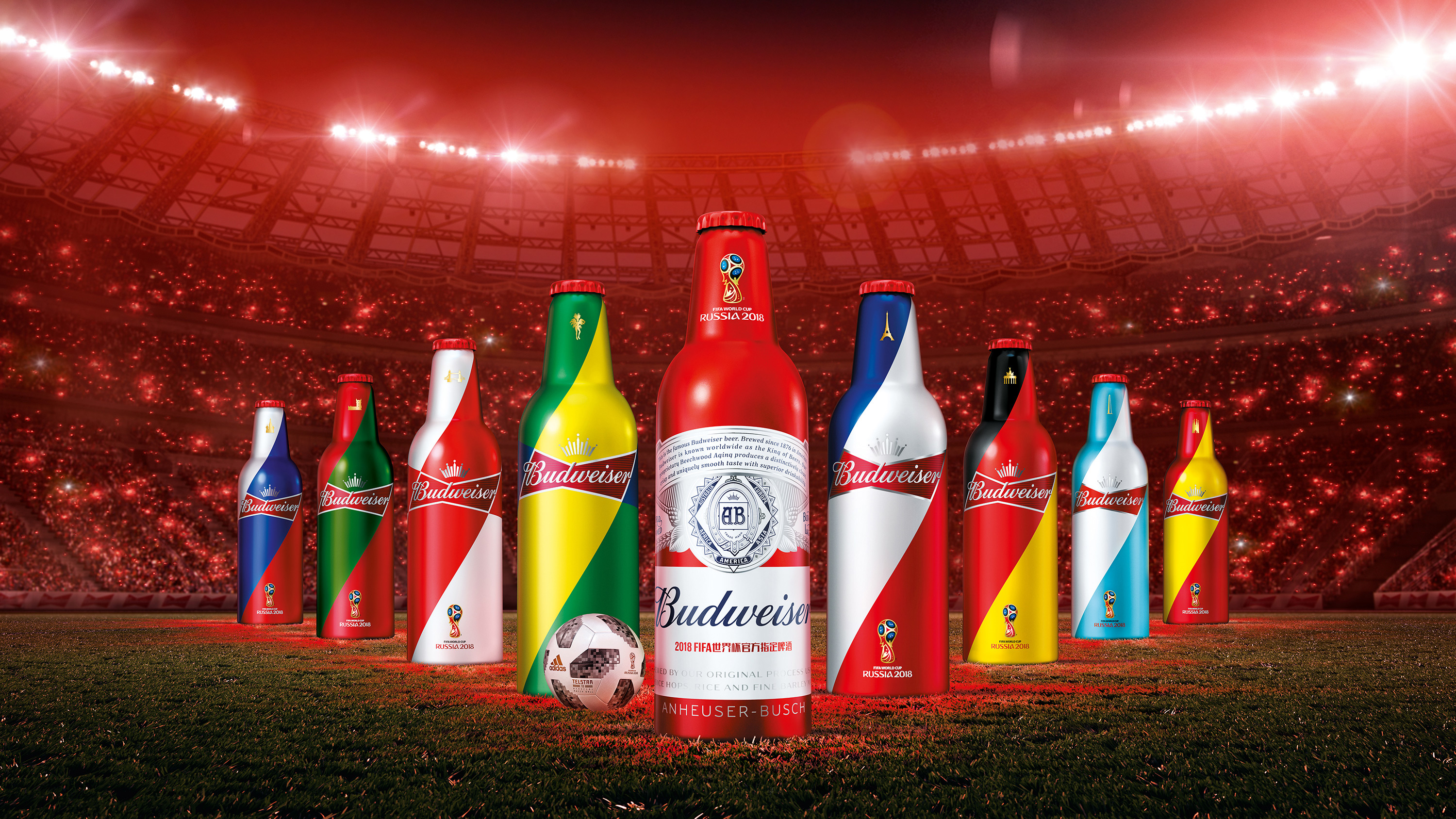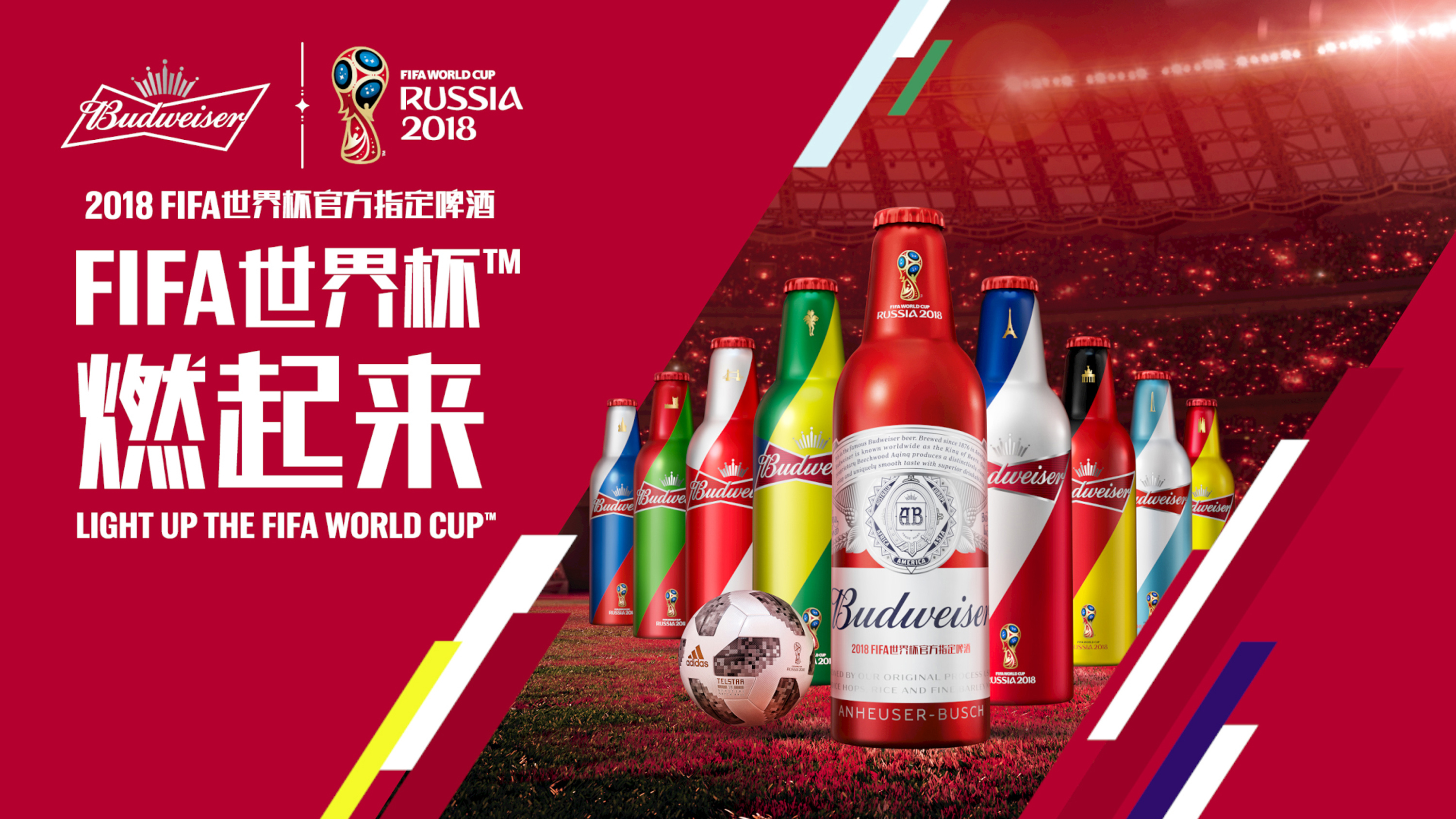 of China’s (other) favourite football teams—England, Russia, Germany, France, Portugal, Argentina, Spain and Brazil—emanating from the iconic Budweiser brand ‘bowtie’.