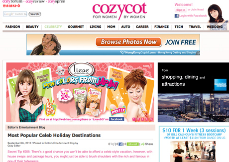 Nielsen's analysis identified that in addition to being active information seekers who share a common interest for cosmetics, beauty and fashion, CozyCot's members were also keen to read about peripheral topics such as travel, weddings, investments, events/entertainment and local current affairs.
