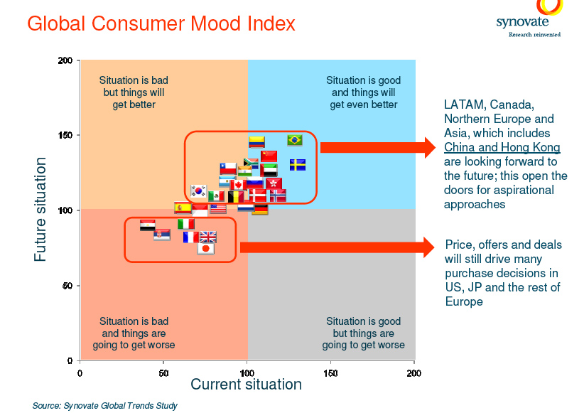 Susanna Lam, research director of Synovate, commented, "China and Hong Kong are the top markets in Asia showing such high optimism toward their own market's economy. Respondents in these markets think the economy is better than it was six months ago, and they believe the economic situation in the upcoming months will be better than it is today."