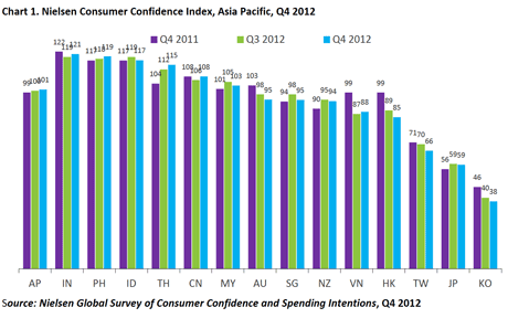 India topped the regional and global list with a confidence index of 121, followed by the Philippines with an increase of one point to 119 and Indonesia at 117, down two points. Thailand recorded the biggest consumer confidence increase in Asia, up three points. China also saw an increase of two points, while Malaysia dipped by two. South Korea showed the lowest confidence in the region, dipping two points to 38.