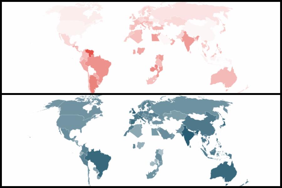 These Warc heatmaps show forecasted adspend declines in 2020 (top) and increases in 2021 (bottom), with darker colours indicating greater change.