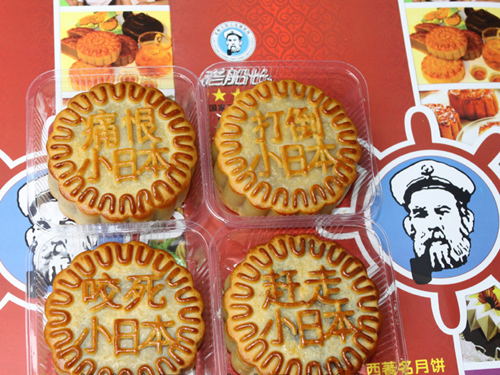 There is a folk tale about mooncakes being used as a vehicle for distributing letters for the Ming revolutionaries in their effort to overthrow the Mongolian rulers of China in the Yuan dynasty. Guangxi bakery Lao Chuangzhang, picking up on current anti-Japanese sentiment in China, has produced a series of mooncakes imprinted with anti-Japanese messages like 'Bite up little Japan'. The photos of these mooncakes have been widely shared on Facebook, a free and successful viral marketing campaign--even if you don't agree with the political stance.