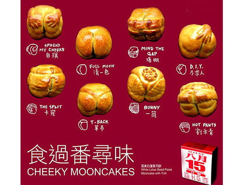 Hong Kong homegrown lifestyle retail shop Goods of Desire (G.O.D.) offers a 'cheeky' line of mooncakes. Launched in 2008, these highly popular mooncakes, fashioned in the shape of buttocks, also convey a play-on-words based on the festival’s date on the 15th day of the eightth lunar month, '八月十五', which also means 'butt'.