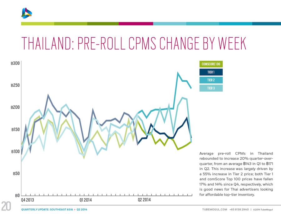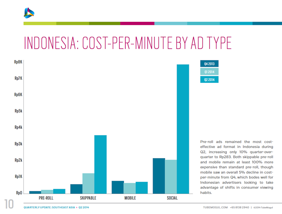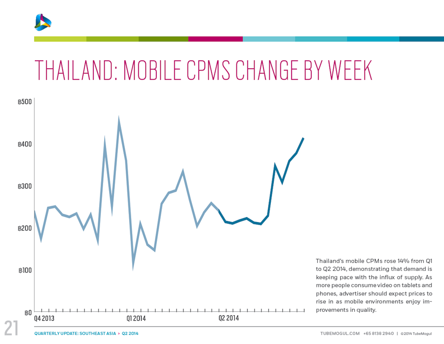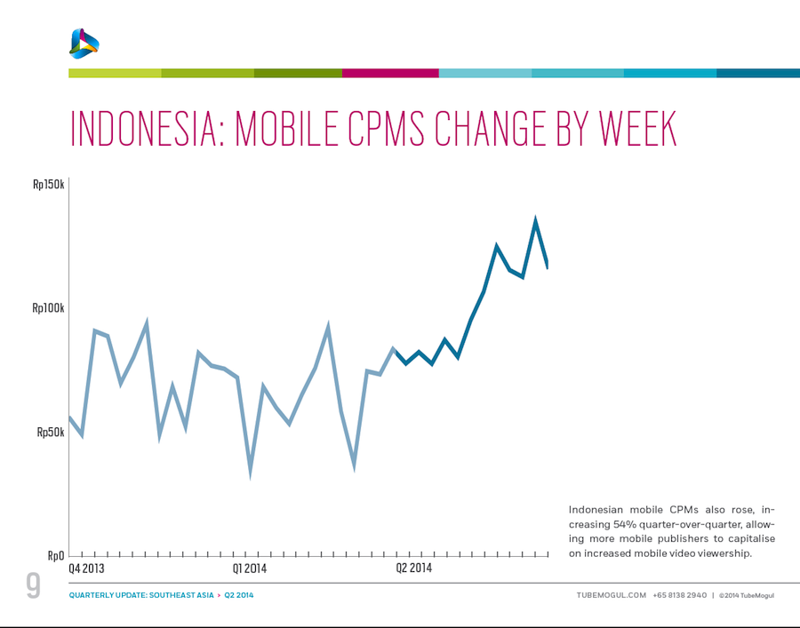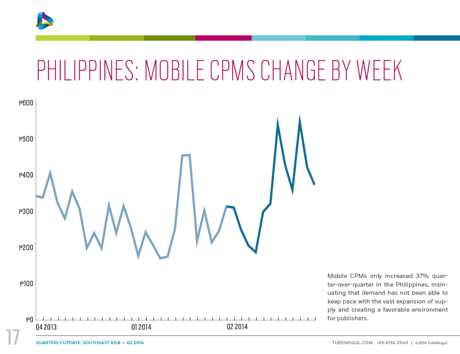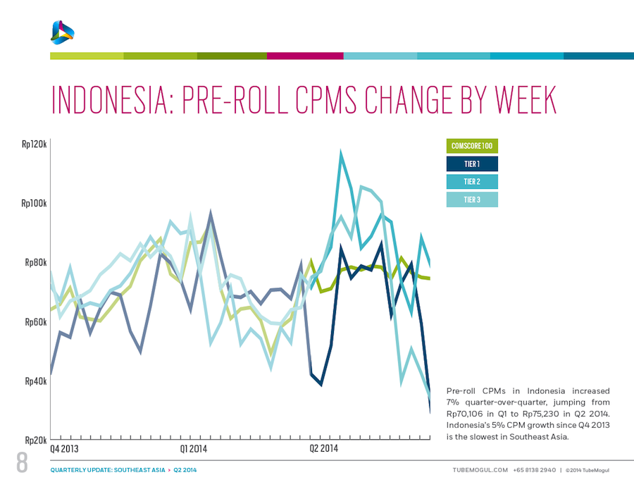 These data, courtesy of TubeMogul, detail trends in inventory, CPM and cost per minute for video advertising (both desktop and mobile) in six Southeast Asia nations: Singapore, Indonesia, Malaysia, Philippines, Thailand and Vietnam. The data come from digital video campaigns run on the TubeMogul Platform in Q4 of 2013 and Q1 and Q2 of 2014, spanning millions of mobile and pre-roll video ad views. Please see the related-article link at the bottom of the page for additional insight from the company.