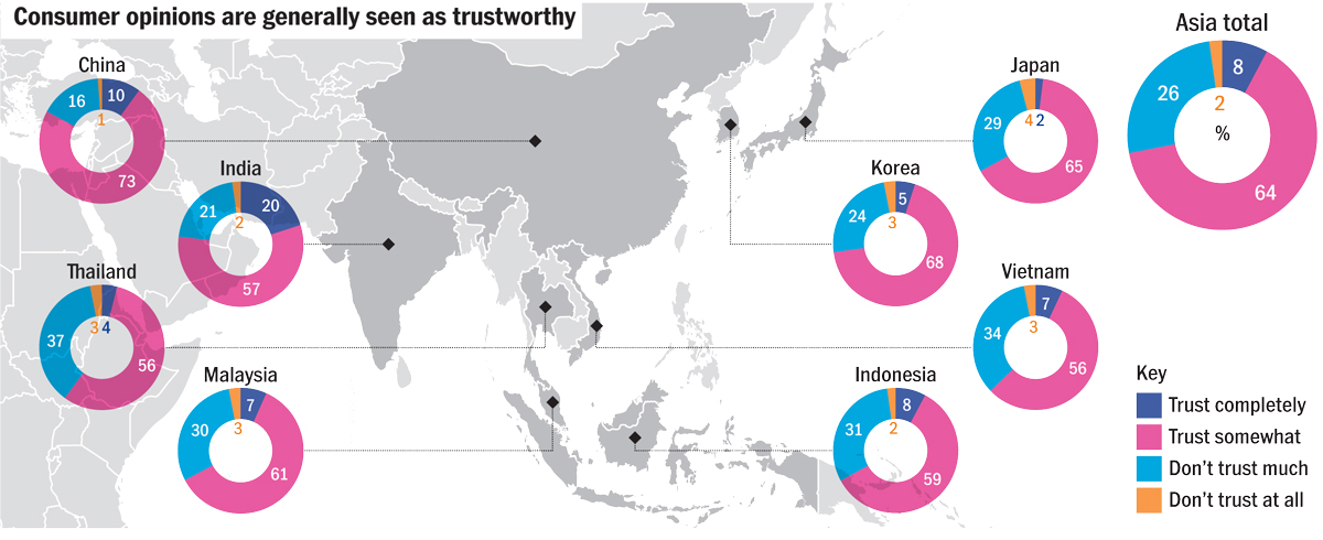 The study also highlights the value of building trust and subsequently word-of-mouth recommendations. In India, 20 per cent of respondents said they trust the opinions of others completely. That figure stands out as an anomaly, but nearly 65 per cent of people regionally said they trust the opinions of peers on social channels, at least to an extent. Not surprisingly given their widespread use of discussion forums, Chinese consumers demonstrate an especially high level of trust in this regard. (Source: Nielsen)