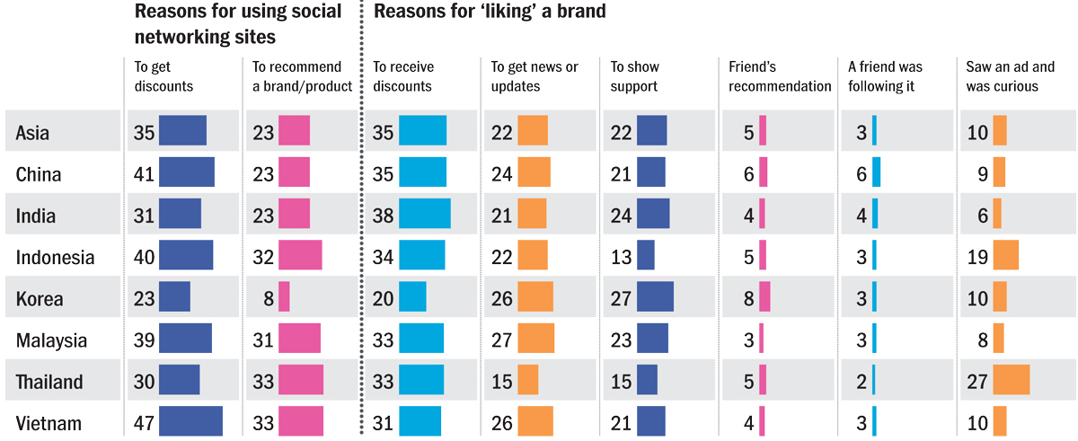 Topping the list of reasons for ‘liking’ brands on social media was the potential to receive discounts, followed by a desire for news updates. (Source: Nielsen)