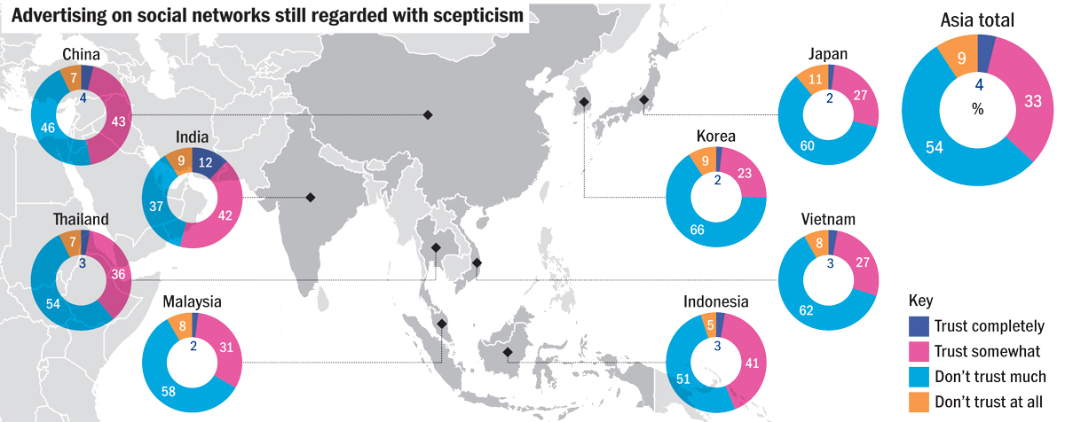 On the other side of the coin, most are still sceptical of advertising — although India proved again to be something of an exception, with more than 10 per cent saying they trust advertising on social networks implicitly. (Source: Nielsen)