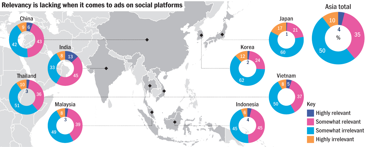 Lack of confidence in social-media advertising may stem from the fact that the advertising that appears on social platforms is seen as being out of context. Half of respondents found it somewhat irrelevant, 10 per cent particularly so. The feeling was most pronounced in Japan, where 17 per cent see advertising on social media as highly irrelevant. (Source: Nielsen)