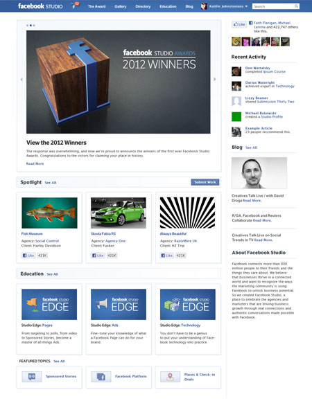 Facebook moved to address the first concern last year with the launch of Facebook Studio, a site showcasing Facebook advertising case studies from agencies all over the world. This was followed by the Facebook Studio Awards, which were held in February.