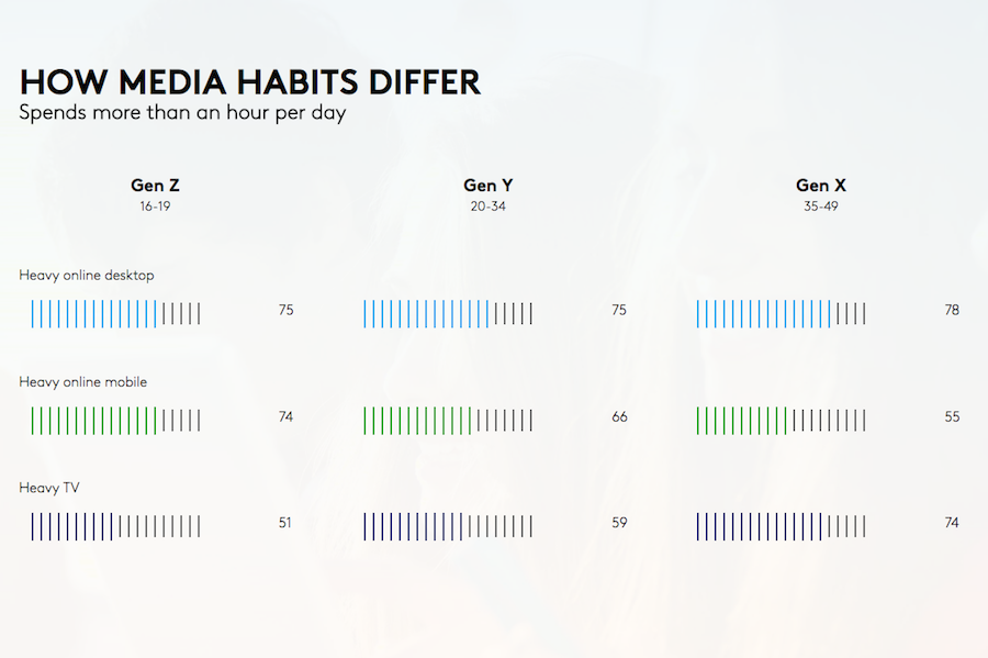 Furthermore, Gen Z is consuming less TV, radio and print media than its predecessors: 52 percent watch an hour or more of TV daily, compared to 77 percent for Gen Y and 77 percent for Gen X.