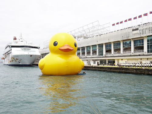 A 16.5-meter-tall rubber duck, created by Dutch conceptual artist Florentijn Hofman, sailed into Hong Kong today and will be stationed at Harbour City until 9 June. The appearance is the city's first maritime art exhibition, according to SK Lam, creative director of AllRightsReserved, which organised the visit of the well-traveled waterfowl, which has floated in Belgium, France, Brazil and Japan. Not surprisingly, the spectacle is attracting lots of smiles and attention.