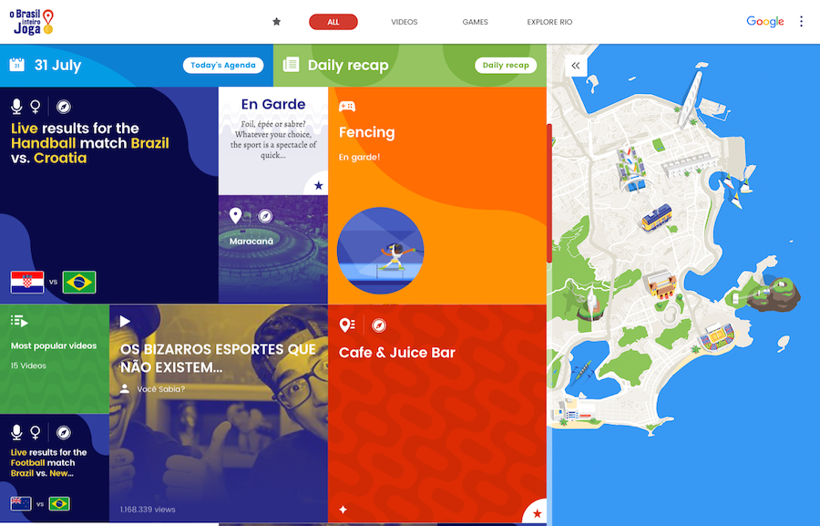 GLOBAL - In collaboration with MediaMonks, Google Zoo has launched O Brasil Inteiro Joga / Brazil Plays. The platform has been in development over the course of the past year and provides video, gaming and geographic content to Olympics fans leading up to the games and on the ground in Rio.