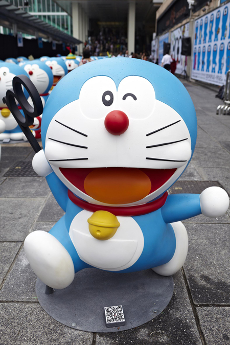 In the popular Japanese cartoon, Doraemon, the title character is born in 2112. Hong Kong shopping mall Harbour City is reaching out to Hong Kong 'kidults' by celebrating the birthday 100 years in advance. The celebration includes an army of Doraemon greeters, decorations throughout the mall, and a Doraemon-themed cafe.