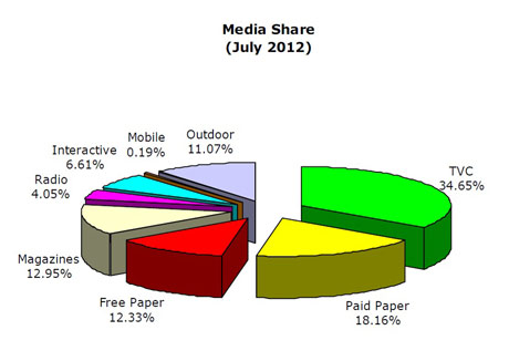 Due to the continuing unstable external economic environment, total advertising dollars invested in July 2012 amounted to US$440 million, a slight decline of 0.3 per cent from June.