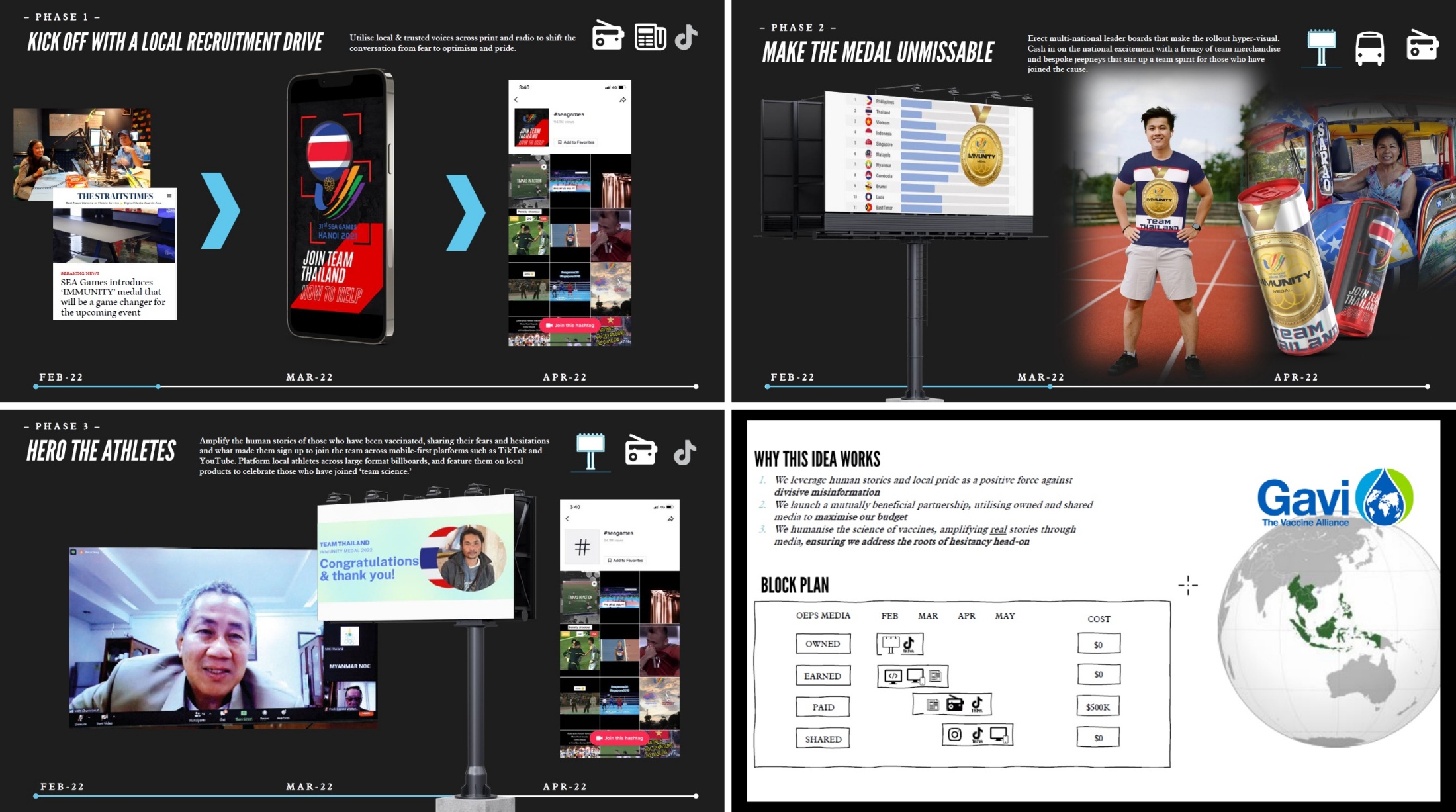 Once they made the connection between the SEA Games and national pride as a motivator, the campaign came together smoothly, with the core idea being to form a partnership with the SEA Games, which would sign on to present a medal to the most vaccinated country at the games.