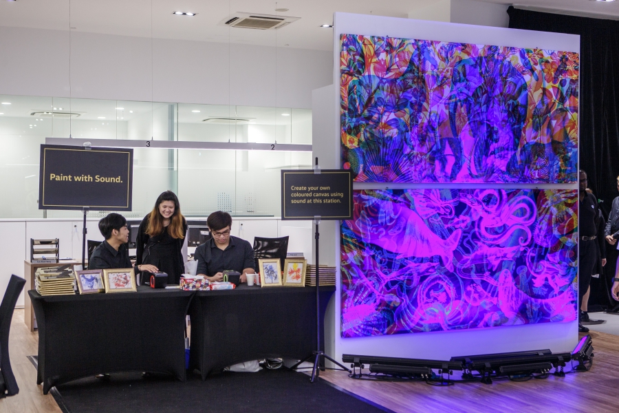 An exhibition of RGB Art by Carnovsky was also installed. The large-scale works reveal different images under different lighting. “Guests were then encouraged to create their own keepsake artwork in a sound painting booth, using vibrations from the music they chose to move paint droplets across the paper,” said Ho.