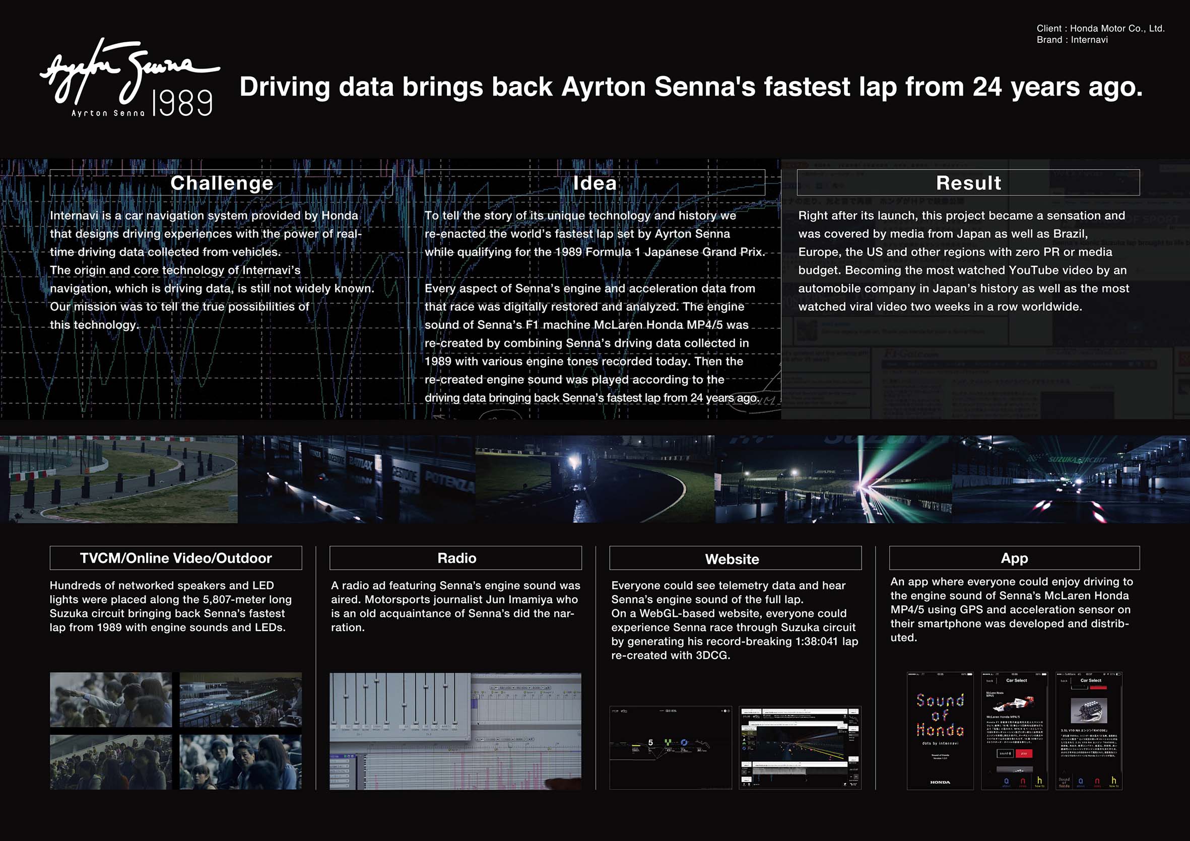 Notably, 'The Chase 360°' and 'Sound of Honda / Ayrton Senna 1989' marked a departure from the conventional approach of focusing on comfort in car advertisements, but an "ingenious, creative" approach to connect product excellence with technological prowess, garnering high marks from the judges. The Honda campaign (see below) also did well at Ad Fest and Cannes this year.