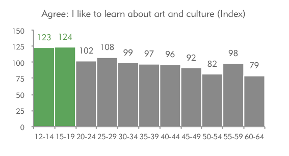 The transition in the lower-tier cities is most detectable in generational divides. Among those born after 1995, a pursuit of beauty has become a prevailing theme that is entirely different from their parents. For the younger set, aesthetics are particularly important and personal. People between 12 and 19 years old showed higher propensity to value culture and art as compared to any age bracket.