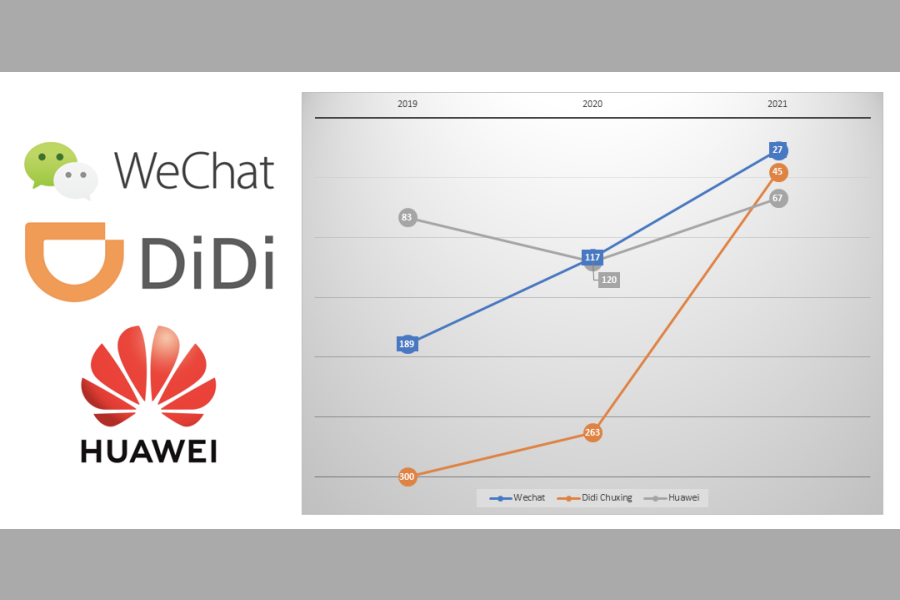 For another year, Tencent's WeChat ranked the highest among all Chinese brands, improving from 117 in 2020 to 27.