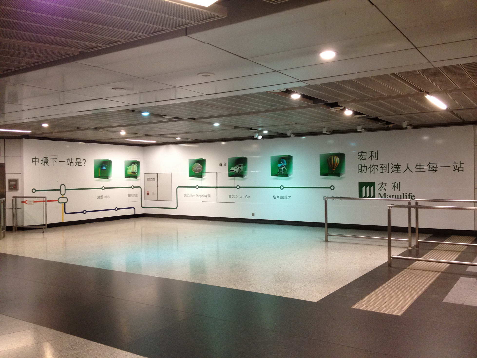 Out-of-home posters of green cubes, which Manulife aims to make synonymous with its brand, illustrate the 'journey planner' concept at strategic major MTR concourses and access points in the Central, Tsim Sha Tsui, Admiralty, Causeway Bay and Taikoo stations. One question asks commuters, "What is your next stop after university?"