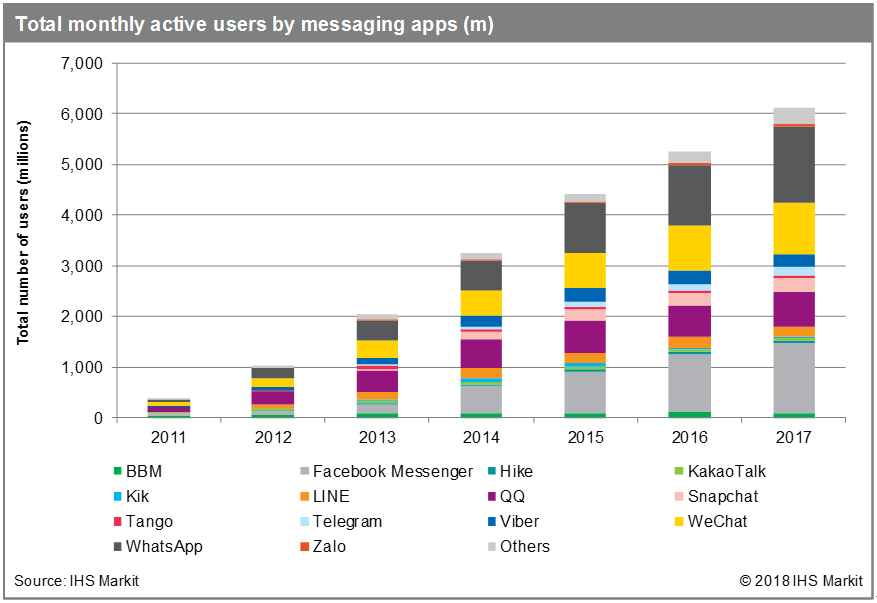 According to a report from IHS Markit, mobile-messaging apps achieved a combined user base of 6.1 billion monthly active users by the end of 2017.