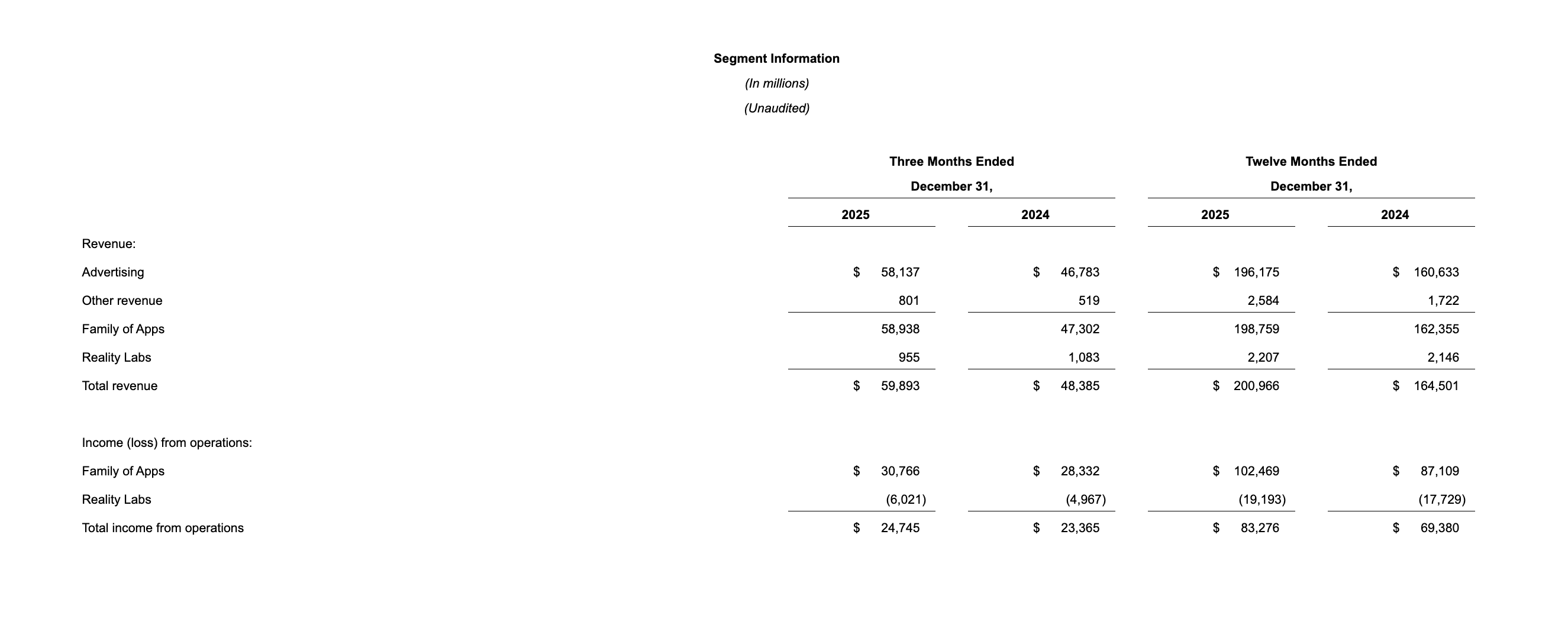 "We had strong business performance in 2025," said Mark Zuckerberg, Meta founder and CEO. "I'm looking forward to advancing personal superintelligence for people around the world in 2026."