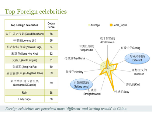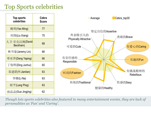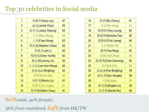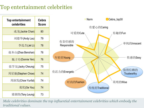 Millward Brown's China Celebrity Z 2012 Q1 Report shows that 43 per cent of brands in China used at least one celebrity as their brand ambassador. Middle-age male celebrities like Jackie Chan, Andy Lau and Jet Li hold the top spots, while female and younger celebrities have more of a following in social media. Here are some interesting findings from the report.