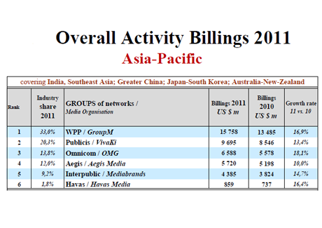 ASIA-PACIFIC - All six media groups posted double-digit growth in the region last year, with WPP's Group M reporting top billings of US$15.7 billion and growth of 16.9 per cent over 2010, according to Recma (Research Company Evaluating the Media Agency industry).