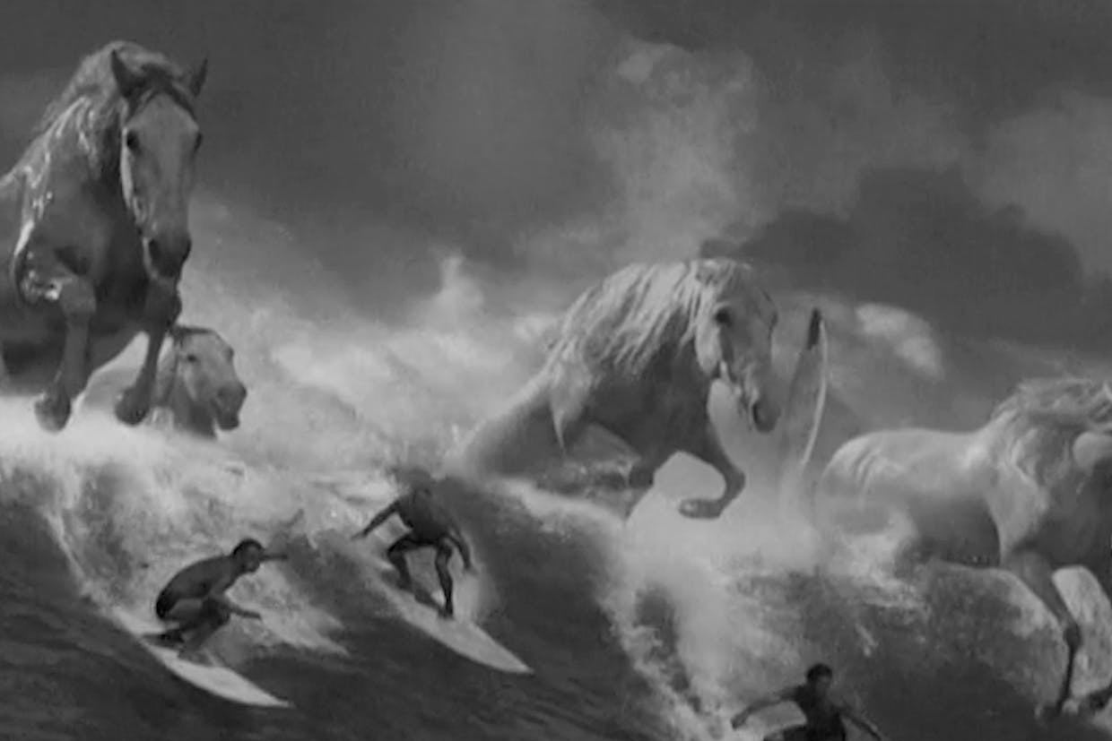 As “Swimblack” went out into the world, “Surfer” came more into focus and it was time to implement the idea. Every detail was essential. For example, I learned that the blue screen on which we’d film the horses would flatten the image. I told Glazer we’d need to get the horses into hair and make-up to put definition back into their musculature and add a bit of flamboyance and Bernini-esque drama to their look, with hair extensions.
