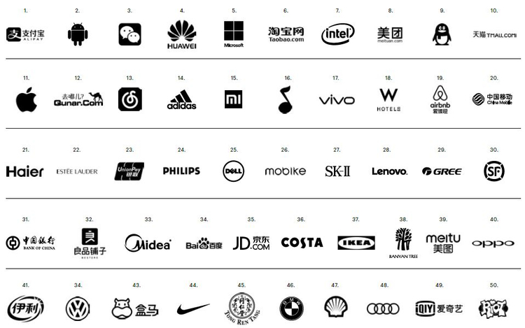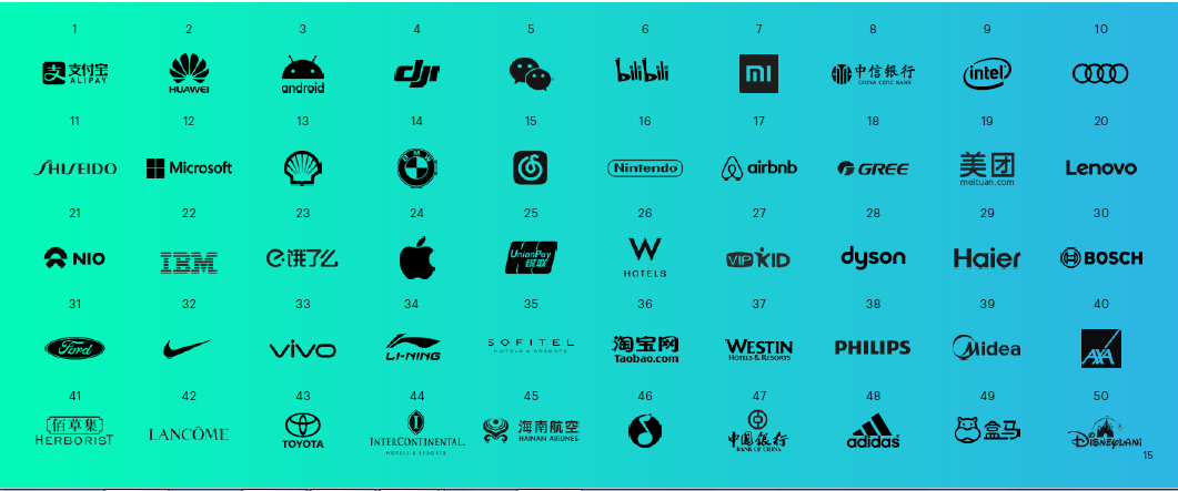 According to the 2019 results, the top 10 most relevant brands rated by consumers are Alipay, Huawei, Android, DJI, WeChat, Bilibili, Xiaomi, China CITIC Bank, Intel and Audi.