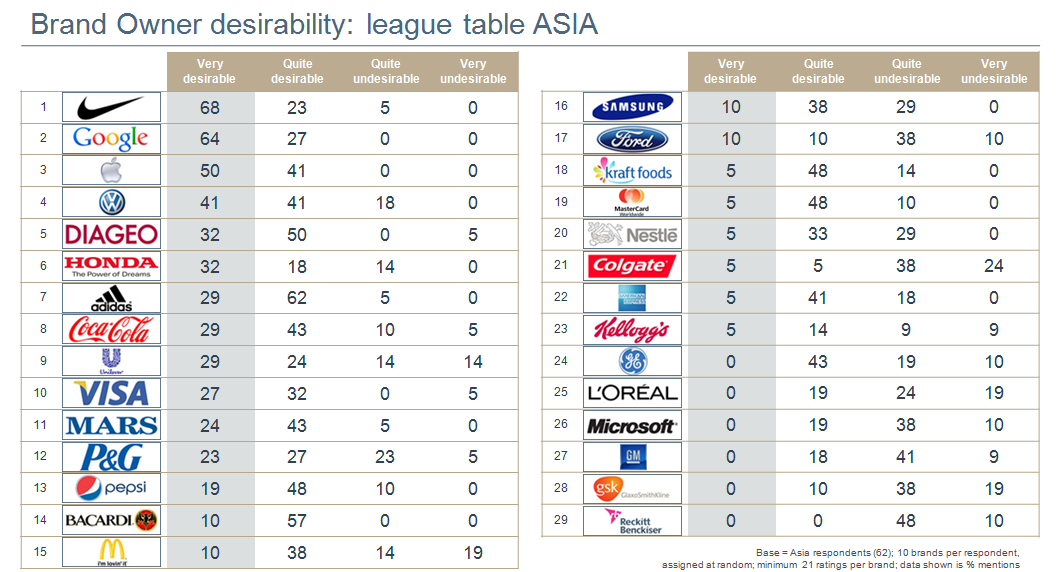 Nike, once again, is rated by Asia agency leaders as the most desirable brand (68 per cent) to work with, and 76 per cent globally valued it as very desirable. The brand leads on six of the seven attributes, falling down on caring about social responsibility.
