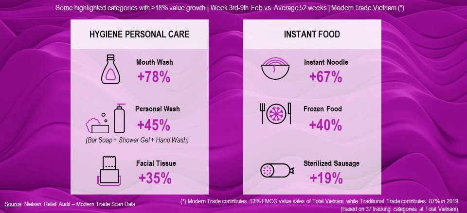 As people stay home, and prepared to be confined for a significant duration, they are also consuming a changing assortment of products at home. For example, there is a strong growth in categories such as instant noodles (+67%), frozen food (+40%) and sterilized sausage (+19%).