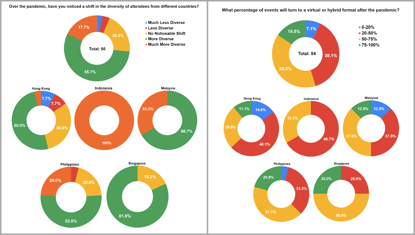 - While 54.8% of respondents believe 50% or more of future events will adopt virtual or hybrid approaches, this belief was strongest in Singapore, where 75% of respondents believe at least half of all future events will be virtual or hybrid events.