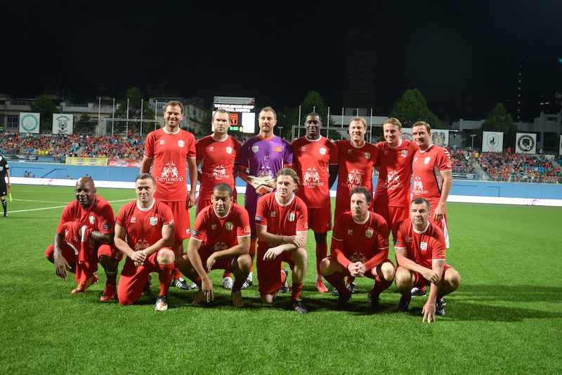 The full Liverpool legends line-up. From left to right: Bjorn Tore Kvarme, Jerzy Dudek, Stephane Henchoz, Steve Harkness, Phil Babb, Jan KomKramp, Emile Heskey, Robbie Fowler, Steve McManaman, Patrik Berger, Vladimir Smicer, David Thompson, Michael Thomas, Ian Rush, Dietmar Hamann, Jari Litmanen