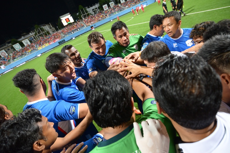 The Singapore Ex-Internationals huddle before their match
