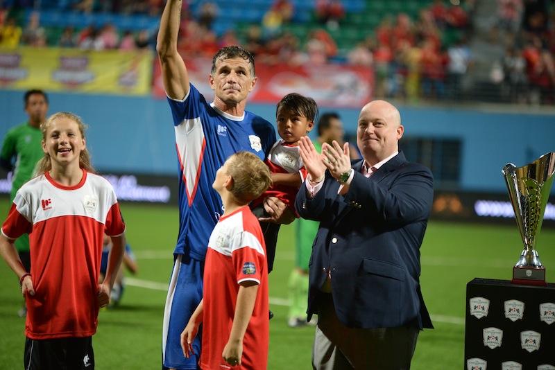 Aleksandar Duric waves at the stands. The match acted as his testimonial match following his retirement on 31 October 2014. Next to him is Chris Comer, CEO and Property Developer, Castlewood Group