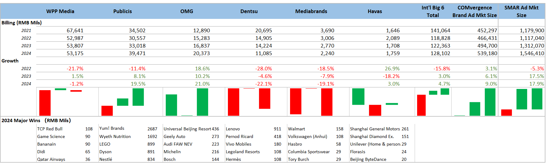 China’s brand advertising market posted a healthy 9% rebound in 2024, climbing to RMB 539.18 billion (US$75 billion), according to data from COMvergence and Ebiquity. But the headline growth masks a more telling shift in the agency landscape: international holding groups are pulling ahead, while local players are losing momentum and money.