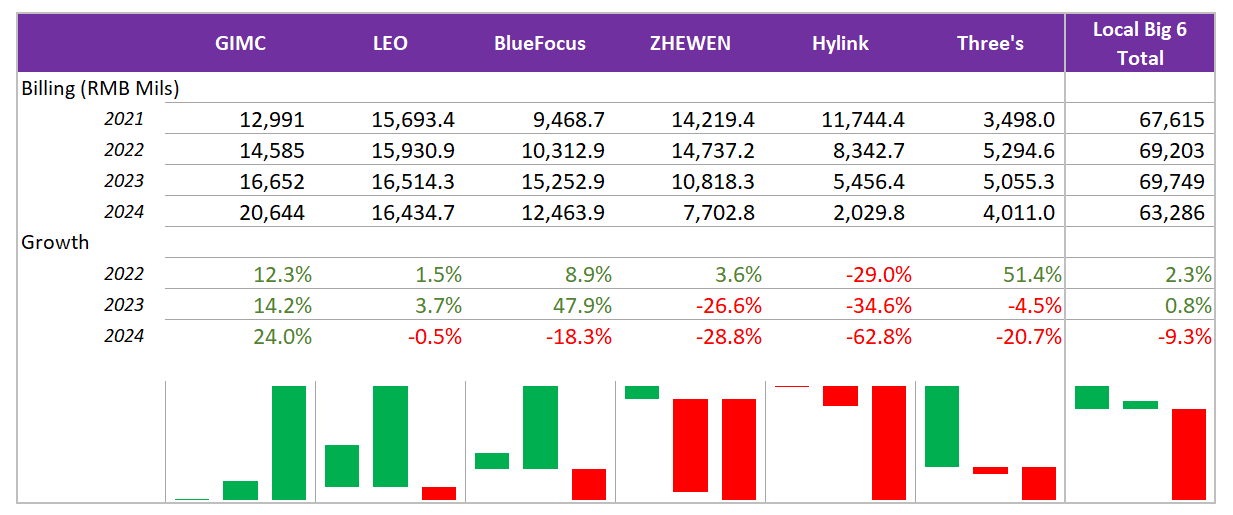 The Big Six grew their billings by 4.7% to RMB 128.1 billion (US$17.9 billion), a 23.8% market share. In contrast, the top six local agencies saw billings fall 9.3% to RMB 63.3 billion (US$8.9 billion), with their market share dropping to 11.7%. Only one, GIMC, managed to grow in 2024.