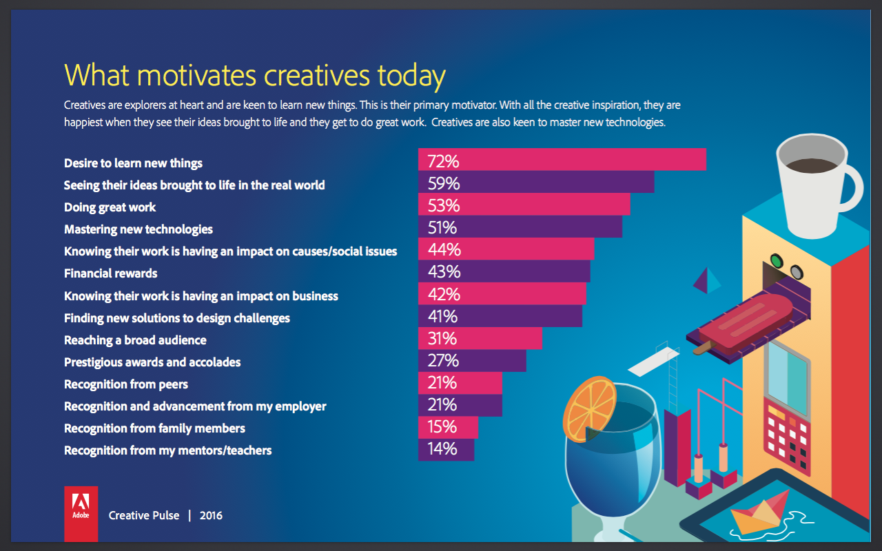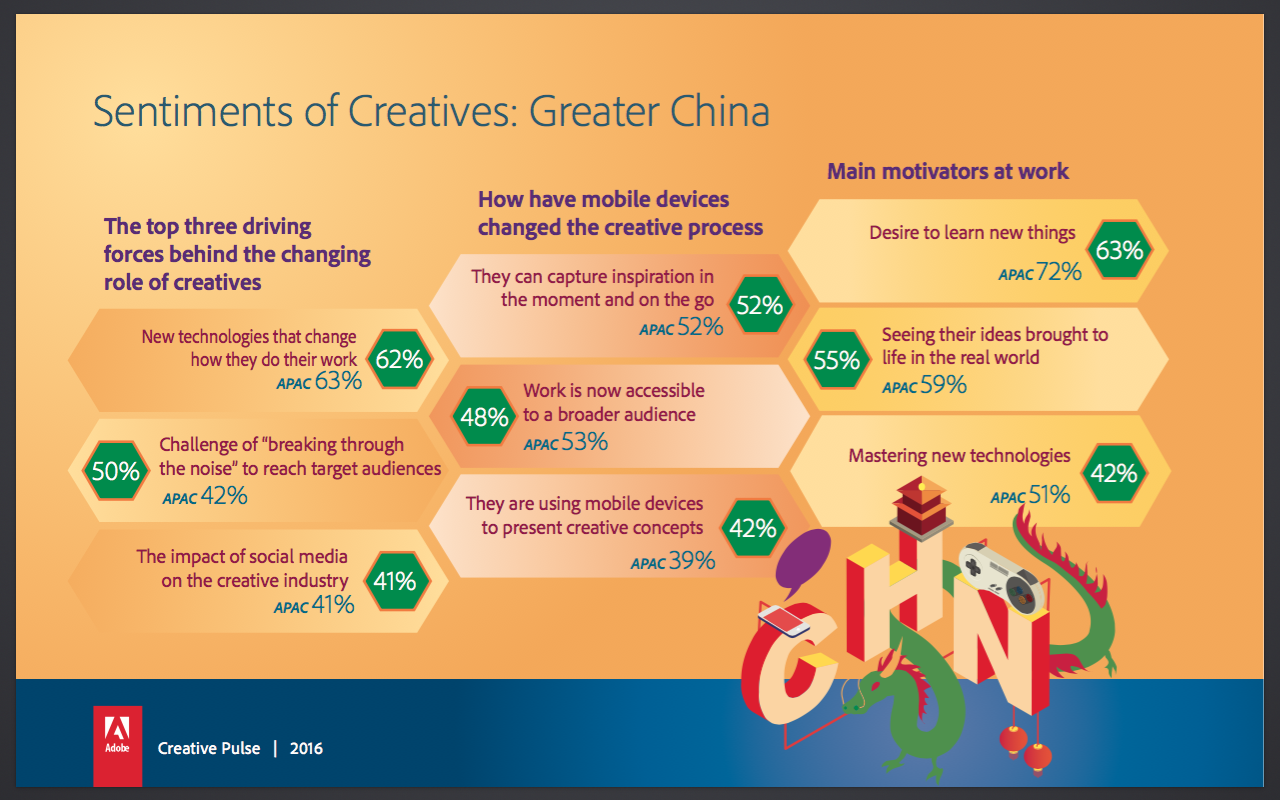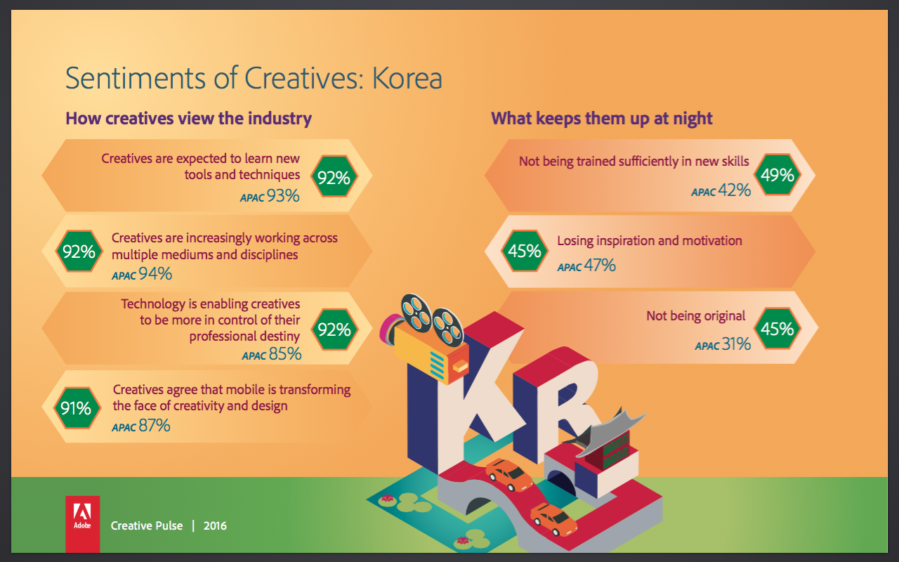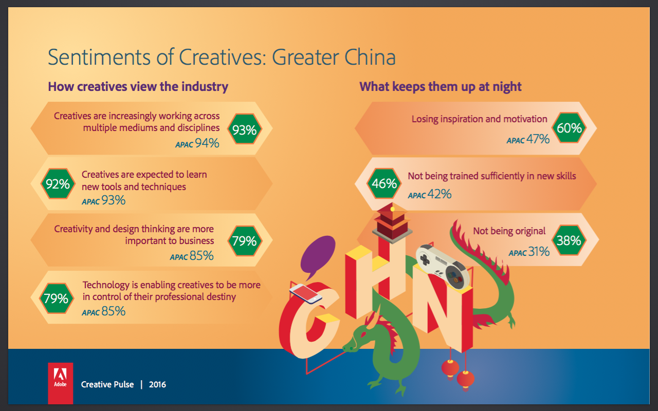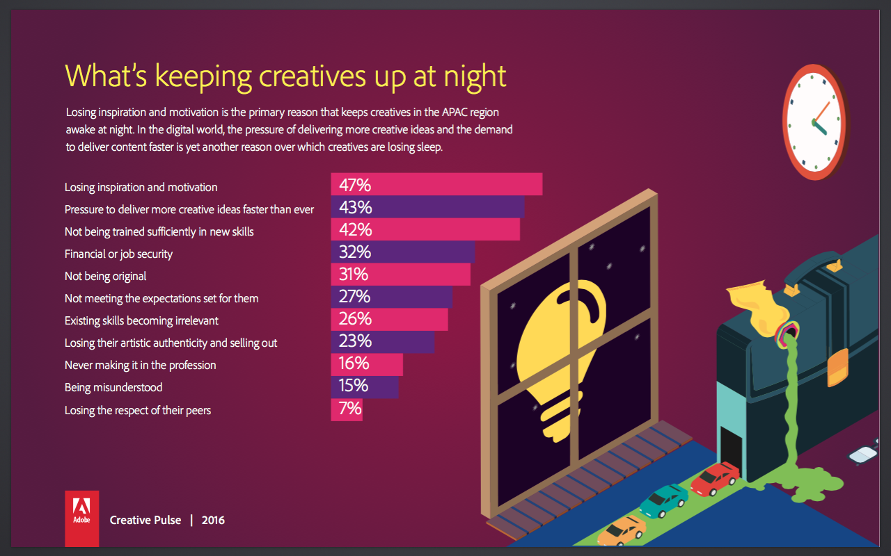 Despite their increasing importance to business, creatives in APAC still stay up at night with uncertainties, just like the rest of the workforce. One of their main worries is the fear they will lose inspiration and motivation (47 percent) while increasing their creative skills.